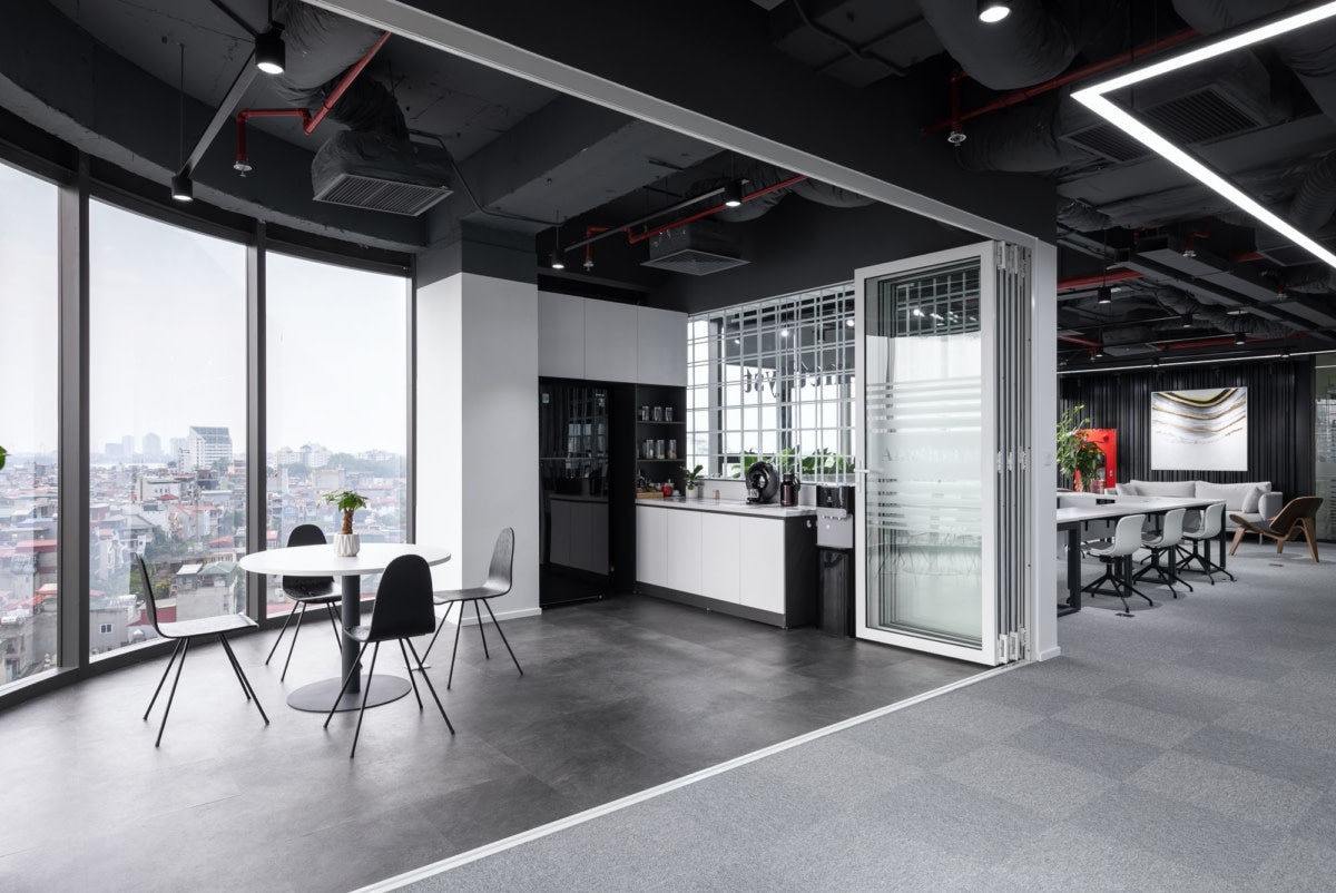 The office design prioritizes separate spaces that meet functional needs while allowing for flexibility, enabling areas to be closed off or opened up as required. The color scheme of black and white adds a professional touch, while also emphasizing the importance of people within the workspace.